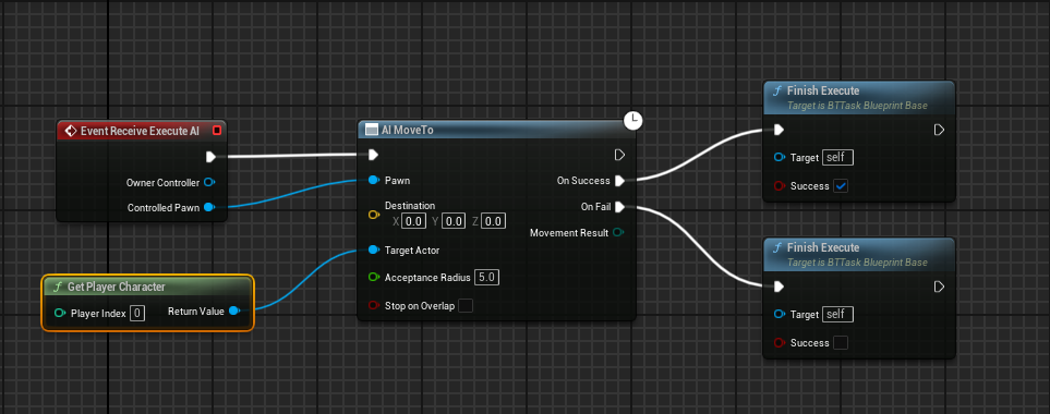 Having the companion simply follow the player character is relative straightforward and is in fact where we’ll start out implementation. By creating a standard AI controller and behavior tree, we can define a behavior tree task that makes the AI move to the target actor’s location (in this case, our player) as shown below.